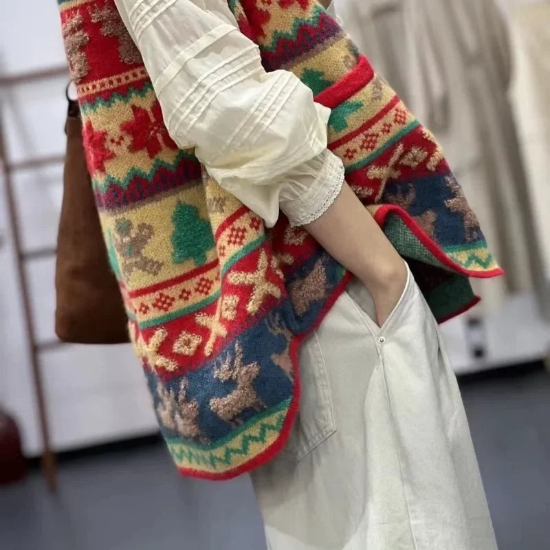 Mit ihrer sanften Haptik und ihrem natürlichen Look unterstreicht diese Weste deine Persönlichkeit und verleiht jedem Outfit eine lässige, dennoch stilvolle Note. Ihr vintage-inspiriertes Design sorgt für eine warme Ausstrahlung, während die offene Passform ein Gefühl von Freiheit vermittelt. Perfekt für kühle Abende, entspannte Spaziergänge oder als modischer Hingucker mit Ethno-Flair.